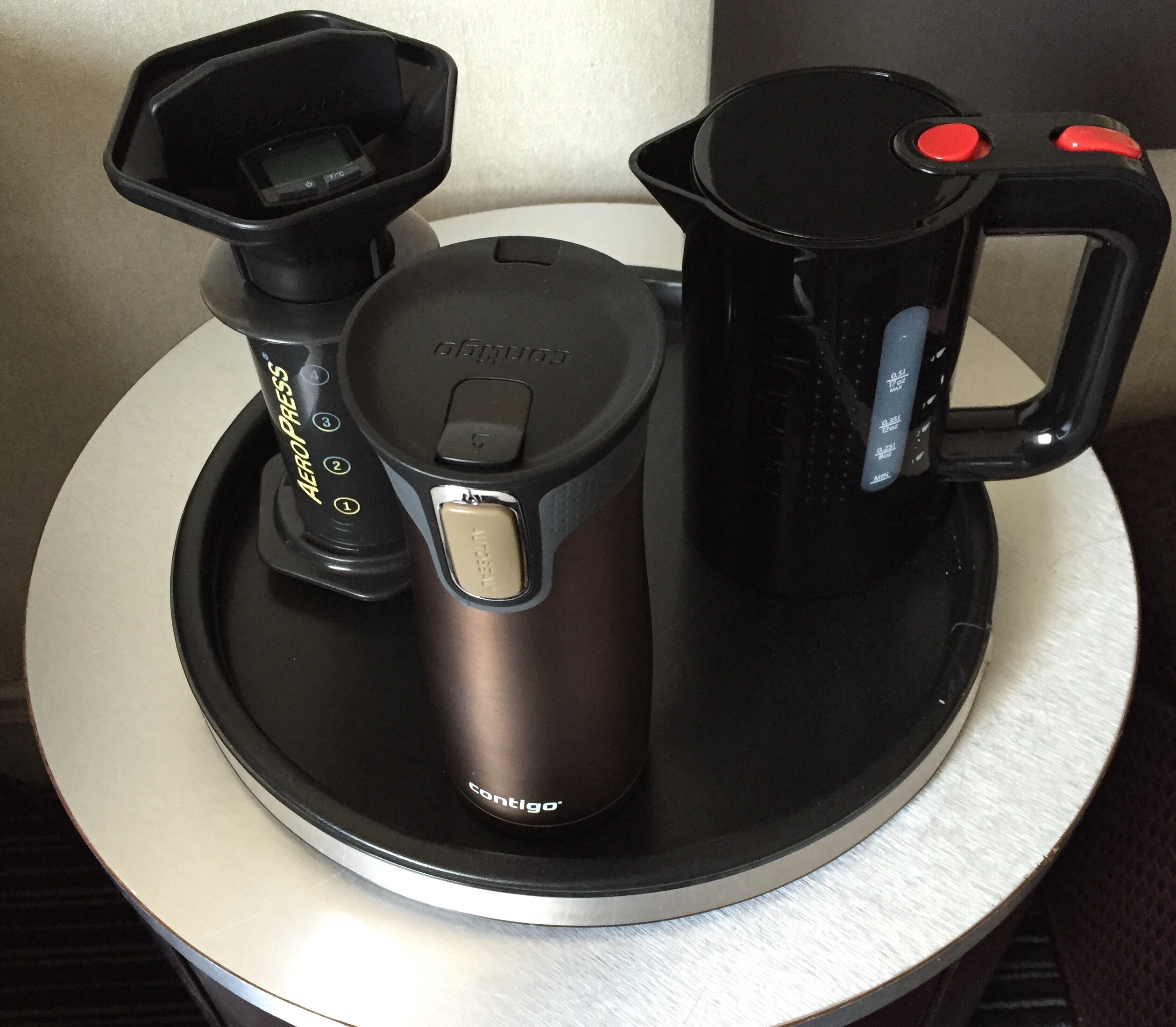 What about water? When I’m on the road, I use bottled water, which fortunately I have in abundant supply. Local water conditions may effect the taste of your coffee, so if you can, bottled is the way to go. As I’ve mentioned, your standard hotel room coffee machine, while being a coffee machine in name only, is an equally unreliable method of producing water at the right temperature for your perfect cup of coffee. I settled upon the Bodum 17 oz. travel kettle. Smaller than your average electric kettle the Bodum gives you the opportunity to get your water to exactly the right temperature. I shoot for about 175 degrees, and yes, I have a thermometer.